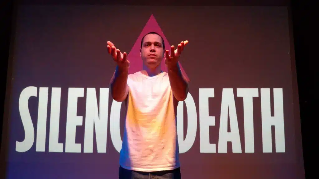 The narrator does not, however, harangue the audience. The first three episodes in The Night Larry Kramer comprise the “Birthday Triptych,” including the aforementioned ages 6 and 22. In between, when he was 16 he saw a production of A Chorus Line in Baltimore. He is moved to tears by the tragic gay dancer Paul, whom he called the “Puerto Rican boy.” He confesses his identification with Paul to another teen boy, Tim, whom he kisses as they are driven home. Caught in the act, he realizes that New York can be the only place for him.