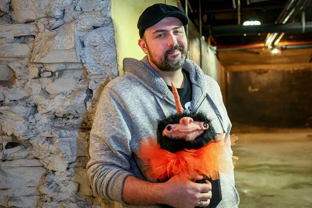 Isaac Bidwell with one of his creations: “If I’m drawing something and I laugh at it, I know it’s going to work.” (Michael Davis/Syracuse New Times)Isaac Bidwell’s art doesn’t exactly fit with what one normally finds in the craft-fair seas of handmade essential oils, pottery and jewelry. Described as “creepy cute,” the pieces for sale through his business Pickled Punks Plush offer a playful iteration of mythology, cryptozoology and vintage sideshow motifs.