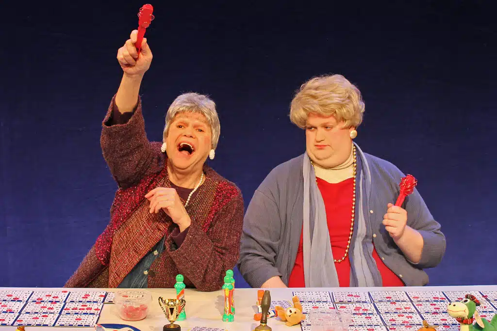 Like professionals arriving for work, Sis and Babe come prepared with the right equipment, including daubers, magnetic chips and reliable good-luck charms. They break through the fourth wall to make eye contact with audience members, treating them like rival players. This almost becomes interactive theater, but no innocent is drafted to become a stooge. This allows the audience to see how competitive the sisters are, especially Babe. She makes cutting remarks about other players before or after she greets them with a smile and a nod.
