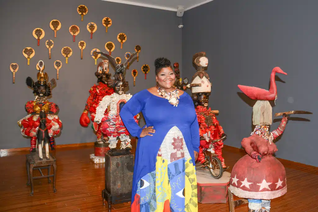 The exhibit also presents six additional power figures in the Robineau Gallery, in the same room as four photographs and 22 adorned paddles created by German. The six figures, all with some form of red color, further document the artist’s imagination. One figure rides a tricycle and has a medium-sized African sculpture on her head.