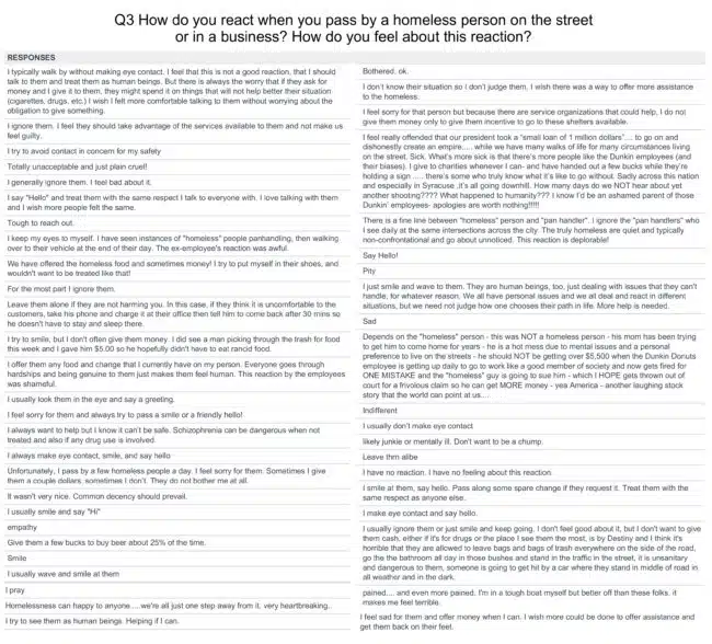 Here are the results to last week’s survey, which surrounded a viral local story about a Dunkin’ Donuts employee pouring water on a homeless man who wouldn’t leave the business. Note: The employee has since issued a public apology and will do 75 hours of community service, Syracuse.com reported.