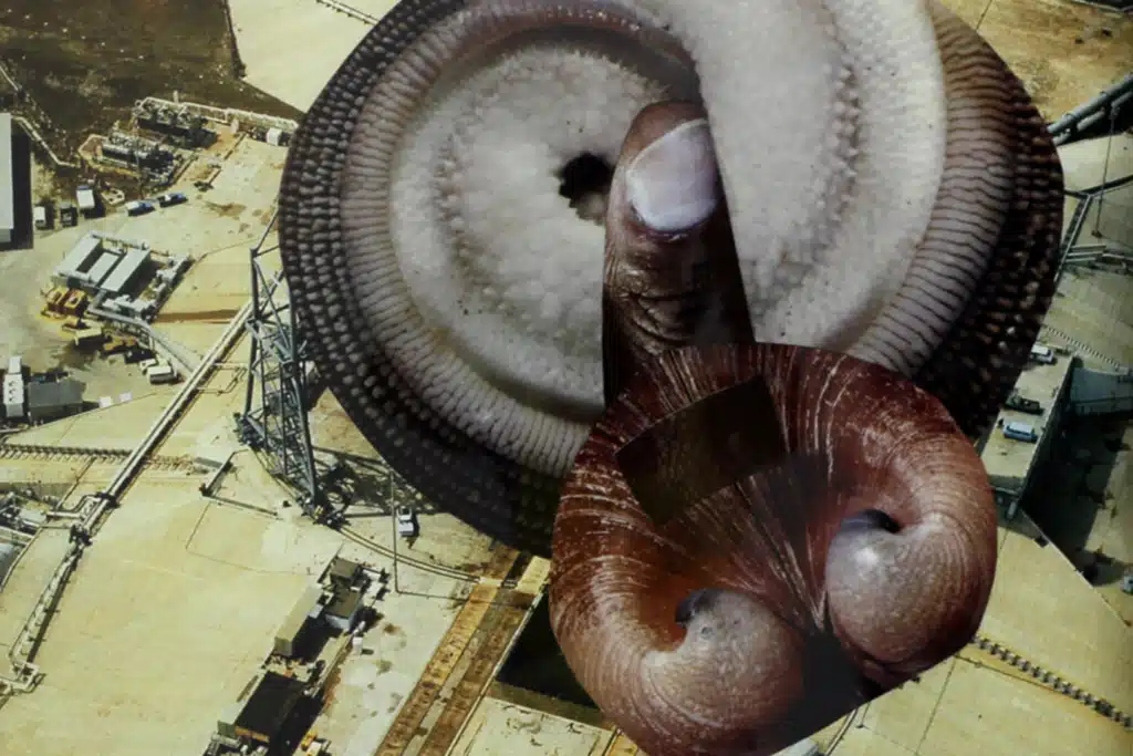 To Sleep with Terra includes various other collages and a work appropriating a photo taken by Marion Post Wolcott, best known for the documentary photography she did during the 1930s and 1940s. For “Mothership,” an imaginative artwork, a flesh-and-blood, male-and-female spaceship, with both human characteristics and those of an ocean creature, hovers above a launch pad.