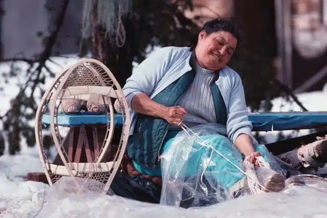 The people living at Kokomville survive by hunting, trapping and fishing, and some of the best images document that work. For example, Lena and Jacob sit on a moose he shot. The animal was later dressed and processed, supplying not only many pounds of meat but also moose hide used for several purposes. In a companion photo, Lena Nottaway’s daughter, Lena Jerome, stretches hide to make webbing for snowshoes.