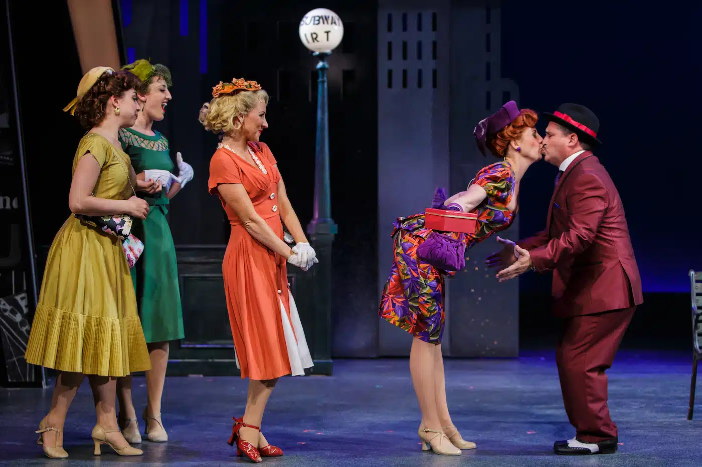 From left, Gabi Stapula, Aimee Lane, Jen Thiessen, Julie Cardia and Carlos Lopez in Merry-Go-Round Playhouse’s "Guys and Dolls."