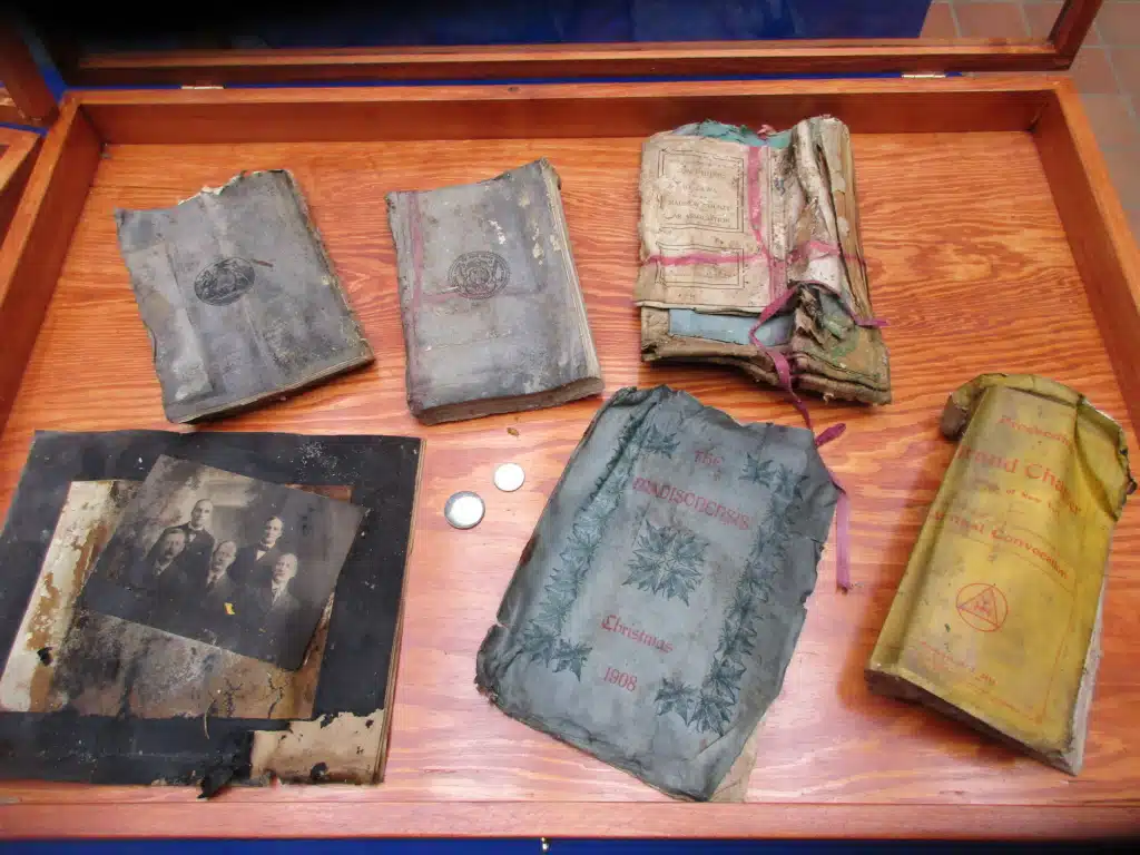 Urtz, wearing gloves, was the first to reach inside the box, and a slight frown was evident when he felt the condition of the contents. Moisture had gotten into the box over the last century, and the artifacts — most of which were paper — were now a soggy, pulpy mass.