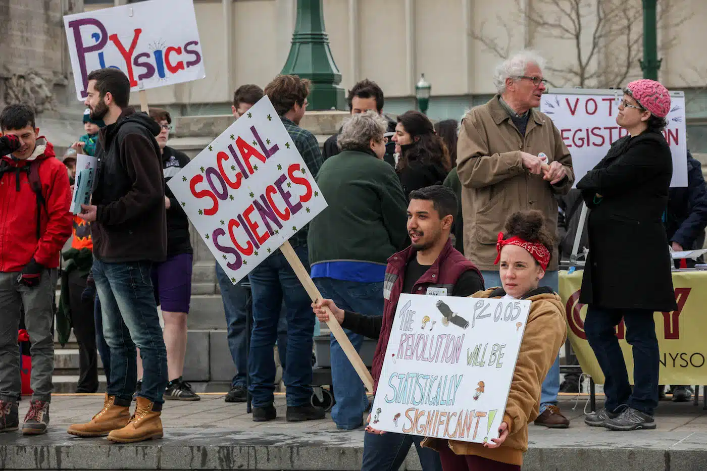 Organizers, including New Feminists for Justice and the Undergraduate Student Association of State University of New York College of Environmental Science and Forestry, invited people to dress as their favorite scientist. Few took them up on that, although the crowd included lots of people wearing lab coats.