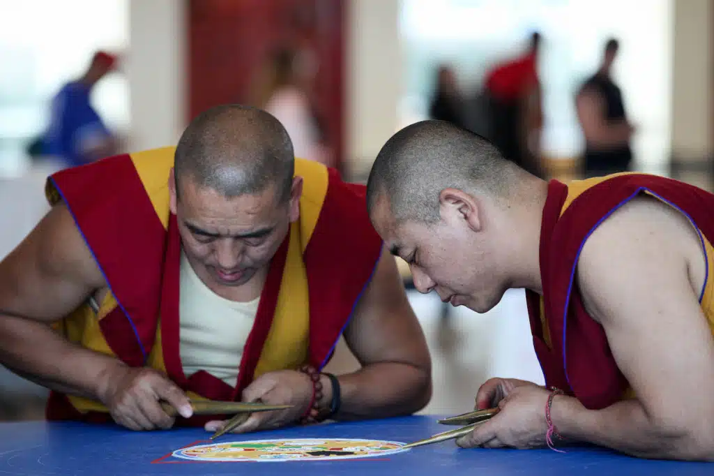A sand mandala is under construction by Tibetan Monks at the Onondaga Community College campus in the Gordon Student Center. The process began Sunday, April 9, and will conclude Thursday, April 13, at 4 p.m. by breaking down the artwork they spent days preparing.
