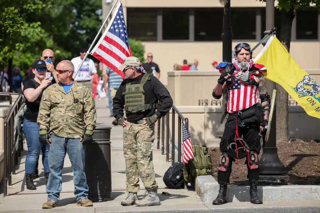 ACT participants carried American flags and wore Trump shirts and hats. At least 12 members of the American Patriot Nation, or Three Percenters, wore fatigues and Kevlar vests and said they were “ready to defend ourselves and the Constitution.”
