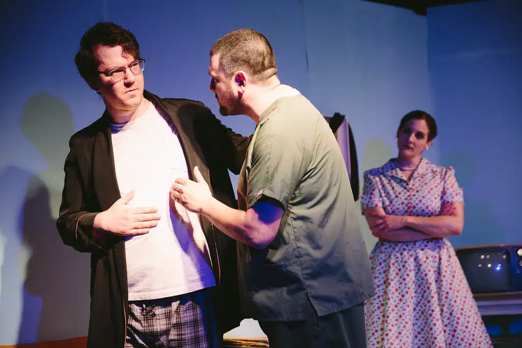 Secondly, no one leaves the set when they’re done with their speeches. After Iago’s fatuous friend Roderigo (Justin Polly) has been exploited, he sits at stage right reading a book. Further, Desdemona (Kristina Rusho), who is neither a patient nor a staffer, is standing a few feet away from Iago (Dan Rowlands), listening when he announces his poisonous plans in soliloquy.