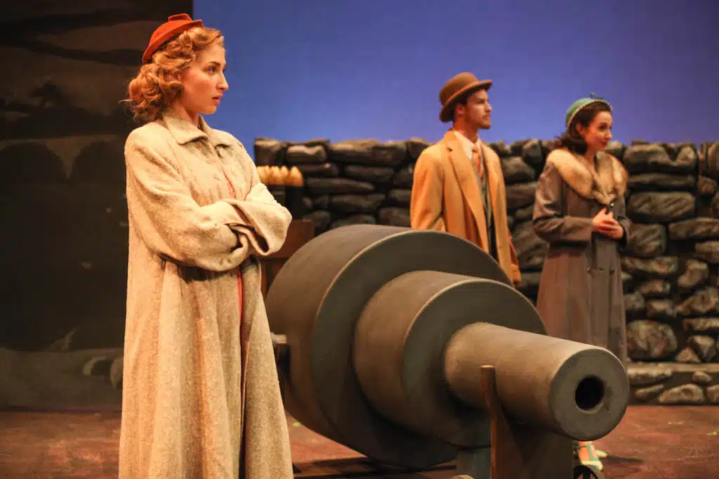 Scene two shifts to the grotty Salvation Army shelter in West Ham. Haley Parks’ noisome set design guarantees that no romanticizing of poverty will be allowed. Andrew has bargained with Barbara that he will visit the shelter if she responds by coming to his munitions factory. The hangers-on, like smudged but pretty Rummy Mitchens (Victoria Madden), and street characters Bronterre O’Brien “Snobby” Price (Jackie McKenna) and Peter Shirley (Danny Polevy), looked borrowed from a Dickens novel. Important dialect coach Holly Thuma has ensured a class-driven lingo just inside comprehensibility. From Oliver Twist comes a meaner, more lethal version of Bill Sykes named Bill Walker (Matthew Mueller), who smashes the face of lovely Salvation Army lassie Jenny Hill (Hannah Shaffer).