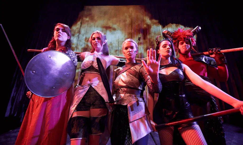 Agnes’ entry is through a comic book dealer, Chuck (Jean-Luc Saliva), where she meets exotic roles created by Tilly’s pals Lillith (Danie Merrill) and Kalliope (Jade Miori), as well as the horned jokester Orcus (Michael O’Sullivan). Bullying cheerleaders turn into canine-toothed predators Gabby (Celina Rescott) and Tina (Morgan Smith). Sparkling dialogue accompanies the visual abundance, with a tart-talking counselor (Samantha Overton) and a scowling fairy named Farrah (Samantha Lee), who comments “Why should I be nice? I’m not Canadian.”