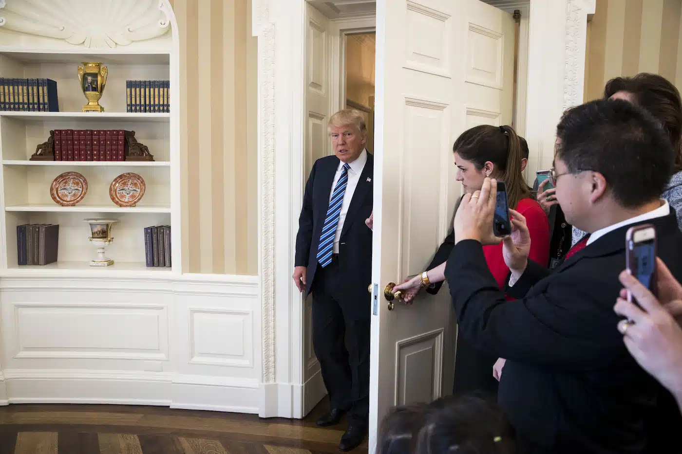 President Donald Trump enters the Oval Office to attend the swearing-in of Jeff Sessions as Attorney General of the United States, at the White House in Washington, Feb. 9, 2017. Photo by Doug Mills of The New York Times