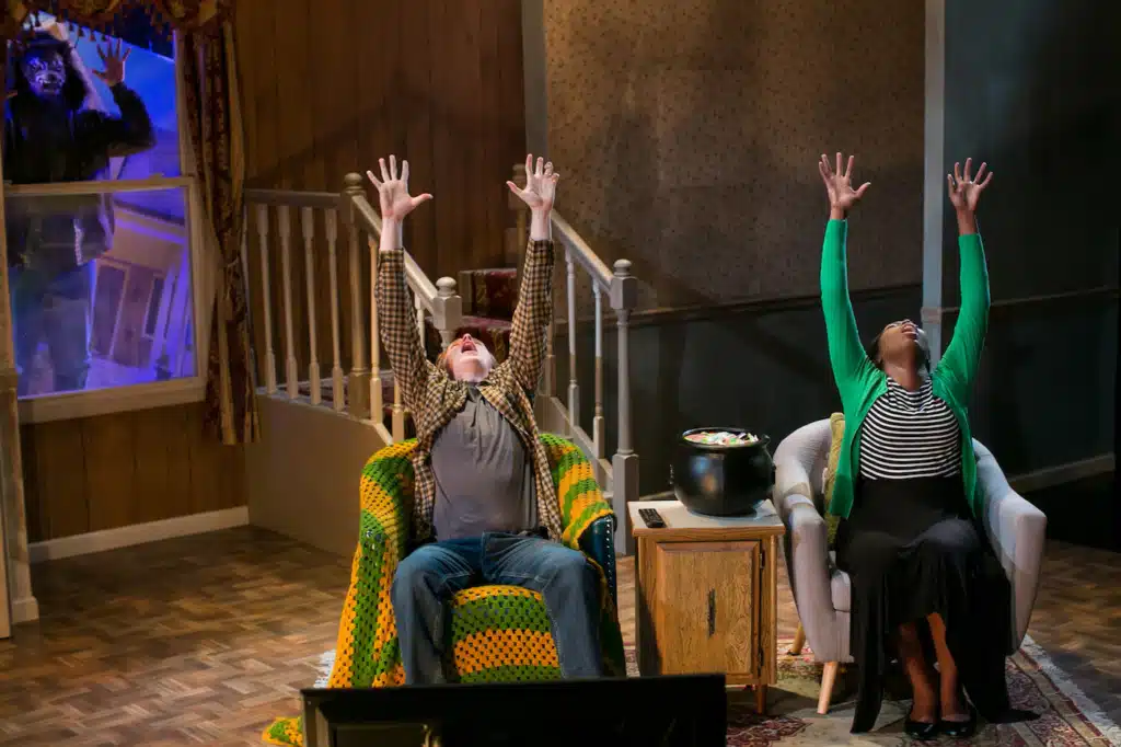 Much of this show, running through Sunday, Oct. 29, at the Redhouse Arts Center, is indeed unpredictable. It begins as a domestic melodrama. The suburban couple at the center of the action, Jeff and Joan, has been married for nine years, and things aren’t going well. Simply trying to find some candy corn turns into a shouting match. At this point in the action, serious movie buffs in the audience will remember that Norman Bates munches the same candy in Psycho.