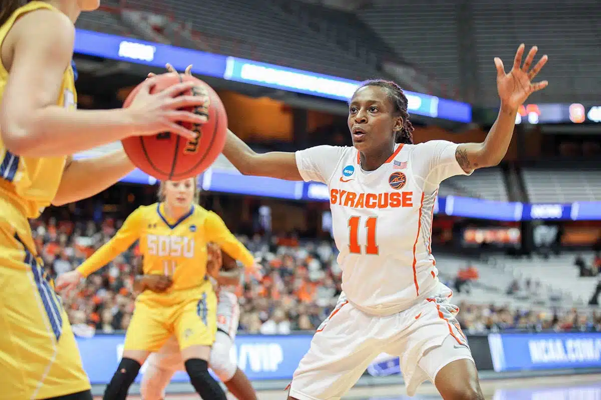 Basketball continued over the weekend at the Carrier Dome, as Syracuse University’s women’s basketball team played the first and second regional rounds of the NCAA Tournament. All went well on Saturday, March 23, as the Orange defeated Fordham, 70-49, with Tiana Mangakahia, Kiara Lewis and Maeva Djaldi-Tabdi on the floor. But the postseason ended Monday, March 25, as the squad coached by Quentin Hillsman lost to the South Dakota Jackrabbits, 75-64.