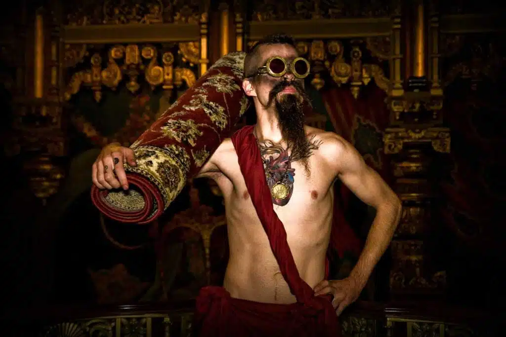 Snarl’s 2016 theme “Folklore” led Harris to the story of Aladdin. Kevin Brite, local photographer and videographer of Brite Side Photography, was outfitted as a “steampunk Aladdin” in Harris’ set. Brite carried a carpet over his shoulder and, at the end of the runway, threw it to the floor. “I jumped on top of the magic carpet to surf on it a little bit, and everyone was cheering,” he said.