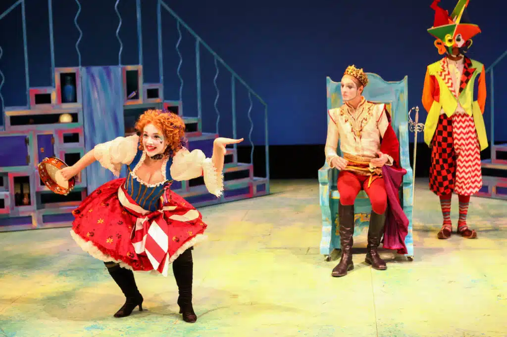 Handsome but lonely, Deramo seeks young ladies willing to audition to be his bride. Ambitious patrons push their favorites. First Minister Tartaglia (Mario Marques) has to tear his reluctant daughter Clarissa (Sarah Hubner) away from her true love Leander (Crawford Horton) to make a faltering play for the Prince’s approval. The ambitious striver Brighella (Allisha Edwards) hustles up his cousin Smeraldina (Kara Cooper), who is smitten with the buffoonish bird-catcher Truffaldino (Emily Bollman). Smeraldina makes her futile play by turning a somersault before the Prince. Finally, the elderly, barely mobile Pantaloon (Sarah Herrman) invites his ballerina daughter Angela (Adriana Schaps) to go up — almost — en pointe to make the family case. It works. And the furious Tartaglia vows revenge.
