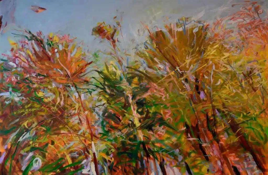 Many of Fitzsimmons’ pieces come from his “Treetop Series,” a group of oils that he began 14 years ago and returns to periodically. These paintings reflect a non-figurative approach. “Sea of Green” is large, vibrant, and full of green color that dominates the canvas. Similarly, explosive red and gold colors rule “When I Look to The East”; indeed, they envelop any trace of trees.