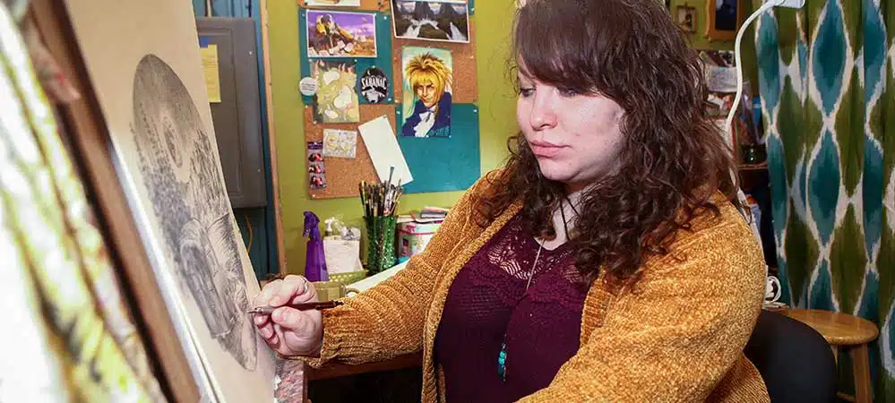 In school, art class was one of the few areas that required her to push her own boundaries. “It was the only thing I could do for hours on end. I was probably a flake to a lot of my friends growing up because I’d be drawing and painting,” she said. That led to classes at the Munson-Williams-Proctor Arts Institute and an application to the Rochester Institute of Technology, where she graduated from in 2010.